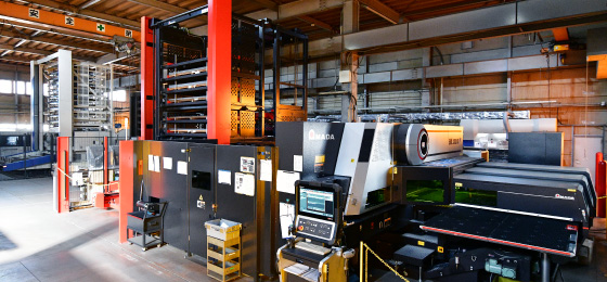 金属の切断には最新のファイバーレーザ複合機を導入しており、材料の積載から加工に至るまで夜間でも自動運転が可能です。